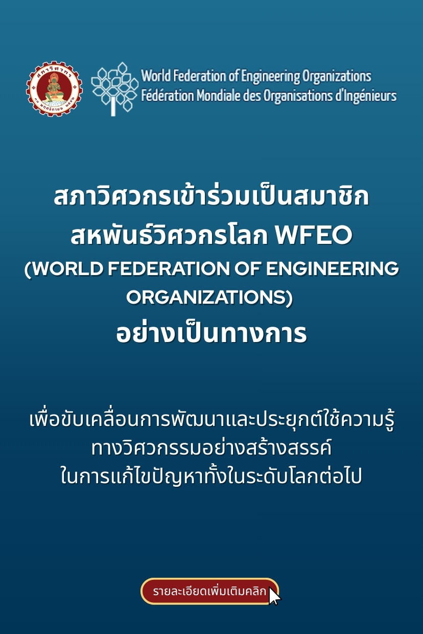 📣ขอเชิญชวนสมาชิกผู้ที่มีความรู้ ความเชี่ยวชาญและประสบการณ์ที่เกี่ยวข้อง 📌สมัครเข้ารับการพิจารณาเพื่อเสนอชื่อเป็น “ผู้แทนประเทศไทย” เข้าร่วมปฏิบัติงานในคณะกรรมการและคณะทำงานของสหพันธ์องค์กรวิศวกรรมโลก (World Federation of Engineering Organizations: WFEO) การเข้าร่วมครั้งนี้เป็นโอกาสสำคัญในการ ร่วมแลกเปลี่ยนองค์ความรู้ สร้างเครือข่ายผู้เชี่ยวชาญนานาชาติ และมีส่วนร่วมผลักดันประเด็นสำคัญของงานวิศวกรรมระดับโลกในนามประเทศไทย ✨คณะกรรมการและคณะทำงานที่เปิดรับ✨ สภาวิศวกรจะรวบรวมข้อมูลผู้สมัครเพื่อประกอบการพิจารณาและเสนอชื่อไปยัง WFEO ตามขั้นตอนต่อไป 🔗สมัคร ➡️ คลิกที่นี่ ********************************************************* 🗓️ปิดรับสมัคร : 20 ก.พ. 2569 📎เอกสารประกอบการสมัคร : CV / Short Biography / รูปถ่ายทางการ 📩ติดต่อ : ฝ่ายต่างประเทศ สภาวิศวกร [email protected] | 086-340-8571