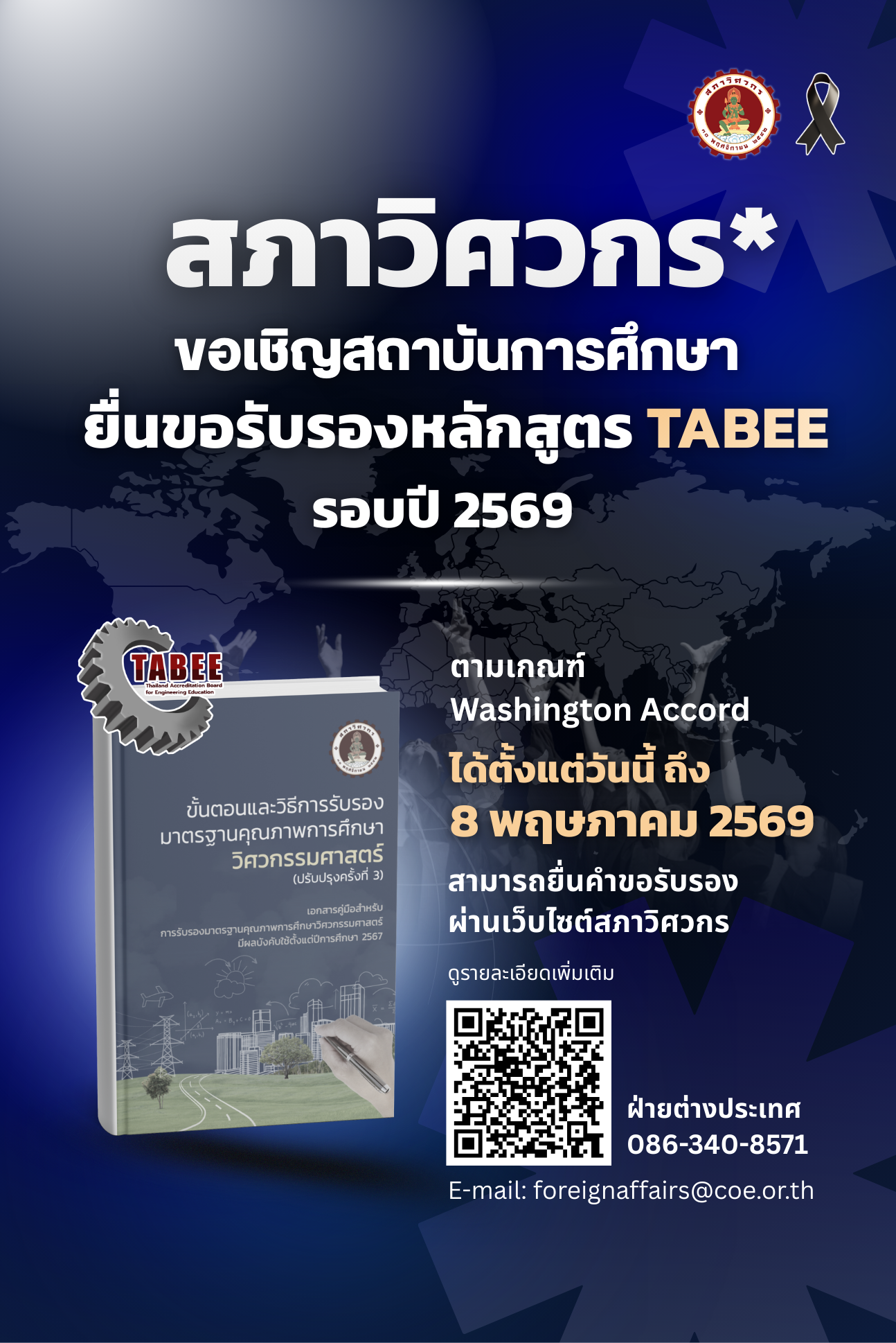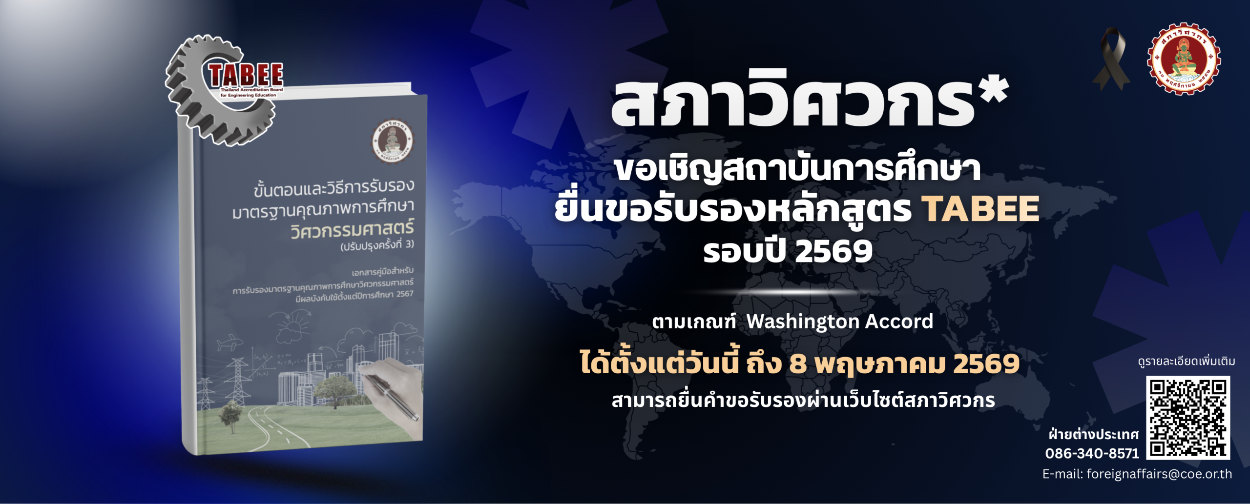 สภาวิศวกรขอเชิญชวนสถาบันการศึกษาที่เปิดสอนในหลักสูตรวิศวกรรมศาสตร์และมีการจัดการเรียนการสอนตามเกณฑ์ผลลัพธ์ (Outcome-Based Education) ยื่นคำขอรับการรับรองมาตรฐานคุณภาพการศึกษาวิศวกรรมศาสตร์กับหน่วยงาน TABEE รอบปี 2569 (ชุดที่ 11) เพื่อเป็นการยกระดับคุณภาพการศึกษาด้านวิศวกรรมศาสตร์ของประเทศไทยให้มีมาตรฐานระดับสากล และเป็นประโยชน์ต่อวิศวกรที่สำเร็จการศึกษาแล้วสามารถไปศึกษาต่อและประกอบวิชาชีพวิศวกรรมในประเทศที่ได้รับการรับรองคุณภาพการศึกษา (Accreditation) ภายใต้ International Engineering Alliance (IEA) 🎉รับสมัครตั้งแต่วันนี้ถึงวันที่ 8 พฤษภาคม 2569🎉 ✨คลิก➡️ ยื่นคำขอรับการรับรองมาตรฐานคุณภาพการศึกษาวิศวกรรมศาสตร์กับหน่วยงาน TABEE รายละเอียดประกอบ รายละเอียดเพิ่มเติม➡️ คลิก หรือหมายเลขโทรศัพท์ 086-340-8571 และ E-mail: [email protected]