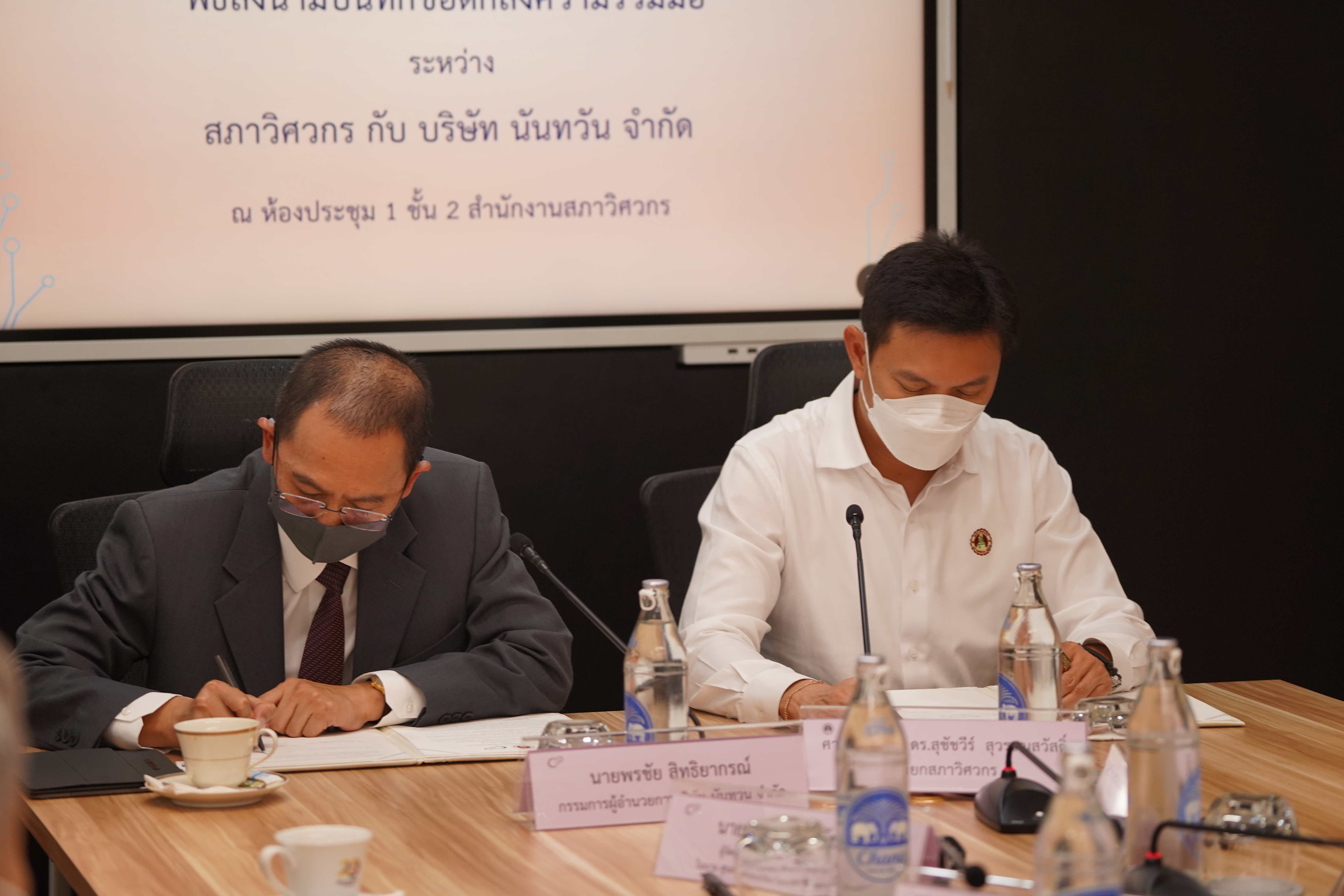 พิธีลงนามบันทึกข้อตกลงความร่วมมือ (MOU) ระหว่าง สภาวิศวกร กับบริษัท นันทวัน จำกัด โดยศาสตราจารย์ ดร.สุชัชวีร์ สุวรรณสวัสดิ์ นายกสภาวิศวกร กับ นายพรชัย สิทธิยากรณ์ กรรมการผู้อำนวยการ บริษัท นันทวัน จำกัด เพื่อพัฒนาคุณภาพทางวิชาการให้แก่บุคลากรที่เกี่ยวข้องกับอุตสาหกรรมก่อสร้างของไทย โดยเน้นการมีส่วนร่วมของผู้ผลิตวัสดุ ผู้ประกอบวิชาชีพ อาจารย์ นักศึกษา หน่วยงานของรัฐและเอกชน ในการจัดทำโครงการวิชาการรูปแบบต่าง ๆ ร่วมกัน เพื่อพัฒนาคุณภาพทางวิชาการให้แก่บุคลากรที่เกี่ยวข้องกับอุตสาหกรรมก่อสร้างของไทย การแลกเปลี่ยนเรียนรู้และพัฒนาวิชาชีพทางด้านวิศวกรรมความปลอดภัย และการบริหารจัดการเกี่ยวกับการก่อสร้าง เป็นไปอย่างมีประสิทธิภาพ รวมถึงยกระดับมาตรฐานวิศวกรไทยให้มีความรู้ ความสามารถ มีความรับผิดชอบ พัฒนาขีดความสามารถของวิศวกรไทยให้มีความพร้อมรับการเปลี่ยนแปลง อย่างรวดเร็วในยุคดิสรัปชัน ส่งเสริมคุณภาพการปฏิบัติงานของผู้ประกอบวิชาชีพวิศวกรรมควบคุมให้ทัดเทียม กับนานาอารยประเทศ โดยมีผู้ช่วยศาสตราจารย์ พิศิษฐ์ แสง-ชูโต เลขาธิการสภาวิศวกร และนายสุรเดช ตันชัชวาล ผู้จัดการทั่วไปฝ่ายบริหารทรัพยากรบุคคล ศูนย์ฝึกอบรมไทย โอบายาชิ เทรนนิ่ง เซ็นเตอร์ ร่วมลงนามเป็นสักขีพยาน ในวันอังคารที่ 30 พฤศจิกายน 2564 ณ สำนักงานสภาวิศวกร