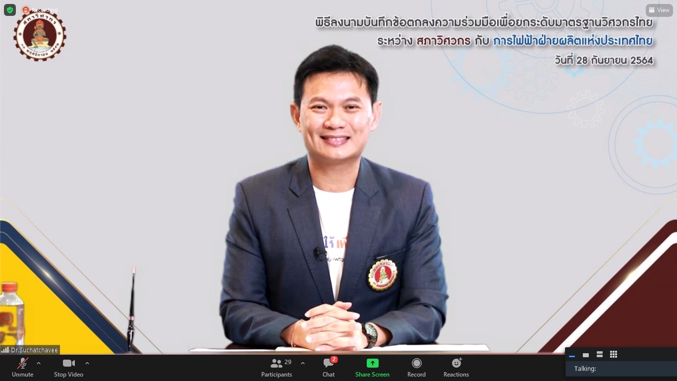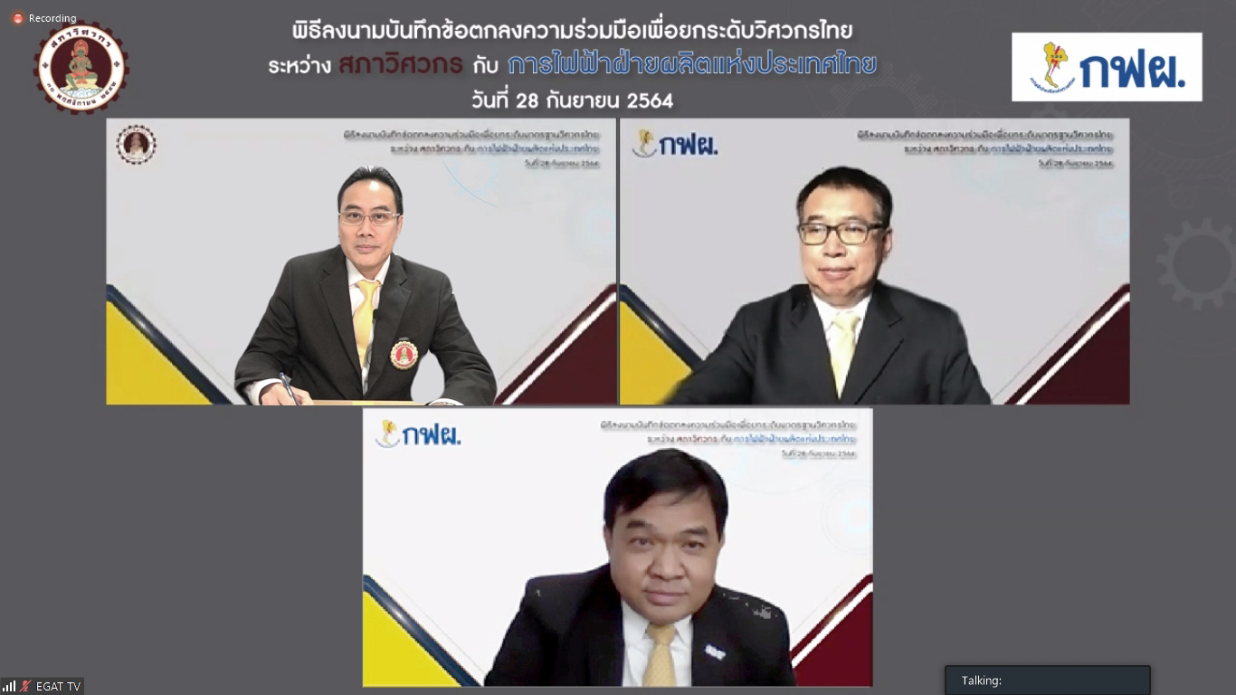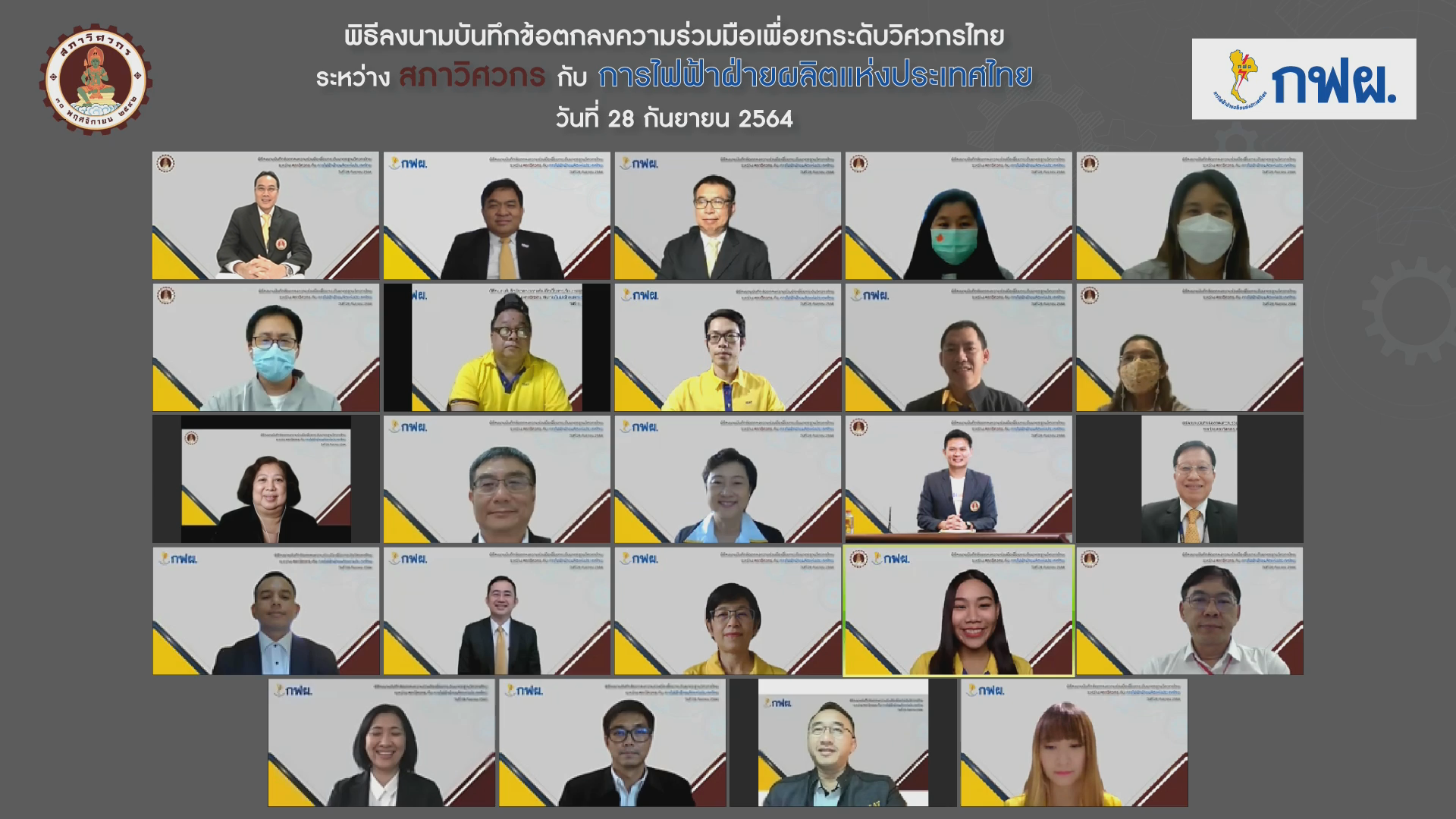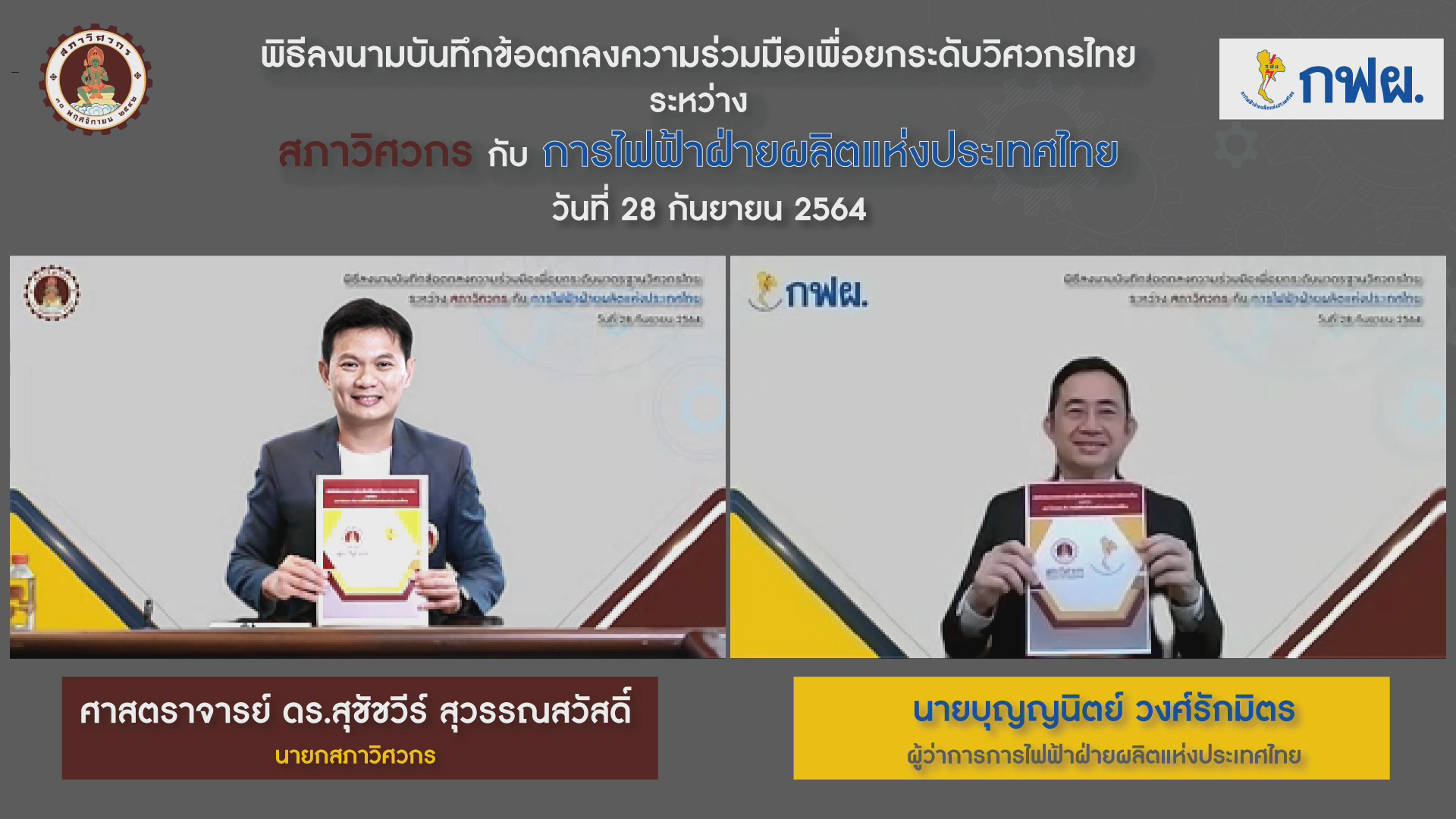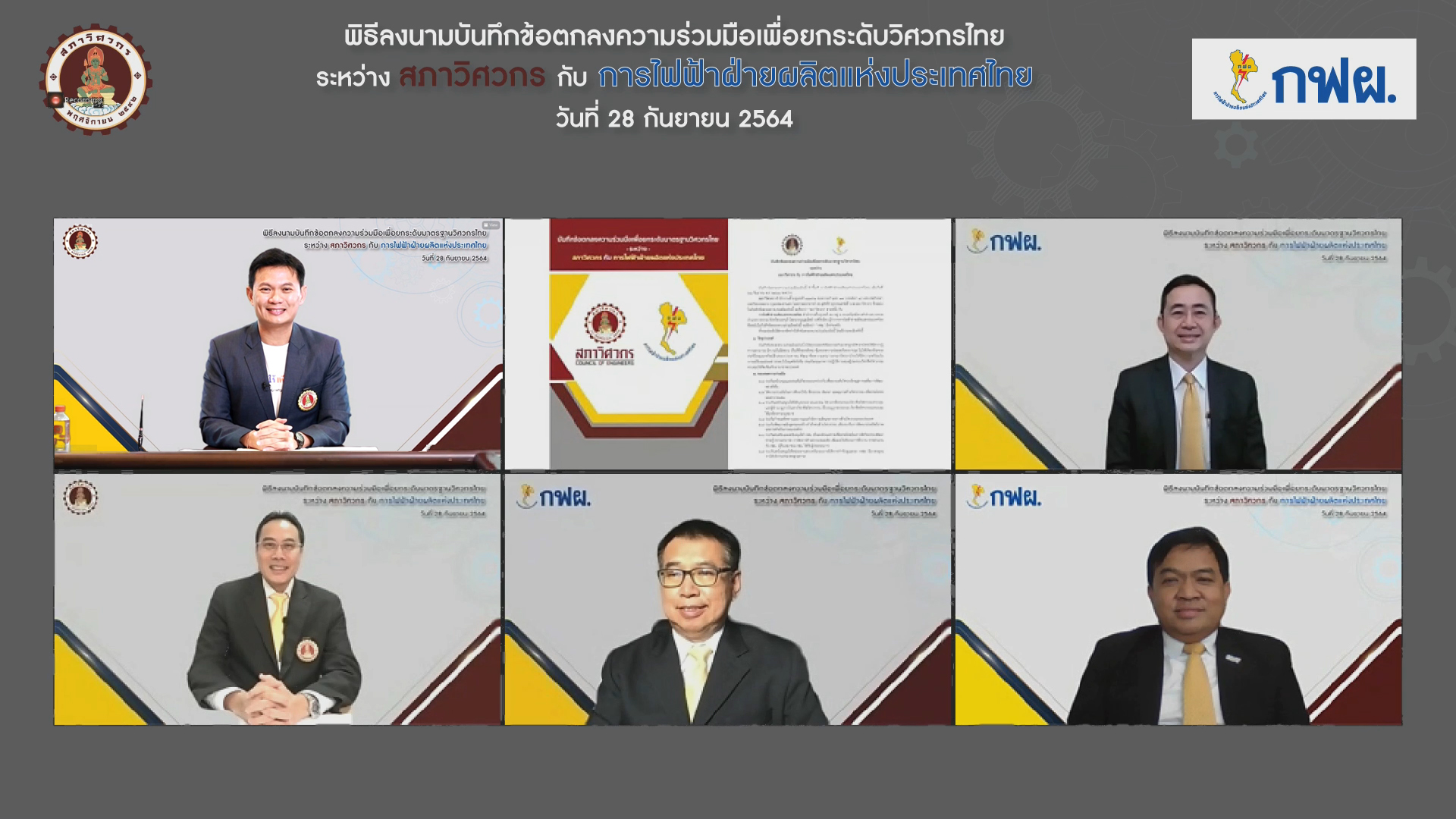 พิธีลงนามบันทึกข้อตกลงความร่วมมือ (MOU) ระหว่าง สภาวิศวกรกับการไฟฟ้าฝ่ายผลิตแห่งประเทศไทย โดยศาสตราจารย์ ดร.สุชัชวีร์ สุวรรณสวัสดิ์ นายกสภาวิศวกร กับ นายบุญญนิตย์ วงศ์รักมิตร ผู้ว่าการการไฟฟ้าฝ่ายผลิตแห่งประเทศไทย เพื่อยกระดับมาตรฐานวิศวกรไทยให้มีความรู้ ความสามารถ มีความรับผิดชอบ เป็นที่พึ่งของสังคม คุ้มครองความปลอดภัยสาธารณะ ไม่ให้เกิดภยันตรายต่อชีวิตและทรัพย์สินของประชาชน โดยมีผู้ช่วยศาสตราจารย์ พิศิษฐ์ แสง-ชูโต เลขาธิการสภาวิศวกร และนายณัฐวุฒิ แจ่มแจ้ง รองผู้ว่าการธุรกิจเกี่ยวเนื่องการไฟฟ้าฝ่ายผลิตแห่งประเทศไทย นายเสน่ห์ ตรีขันธ์ ผู้ช่วยผู้ว่าการธุรกิจบำรุงรักษาการไฟฟ้าฝ่ายผลิตแห่งประเทศไทย ร่วมลงนามเป็นสักขีพยาน ในวันอังคารที่ 28 กันยายน 2564 ผ่านระบบออนไลน์ Zoom Meeting
