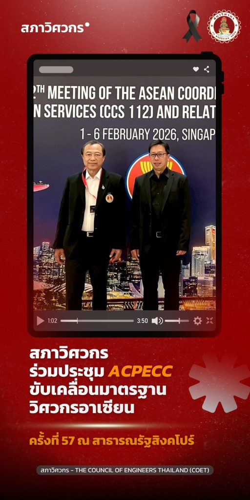 เมื่อวันที่ 2 กุมภาพันธ์ 2569 สภาวิศวกร โดย รองศาสตราจารย์ ดร.สุธา ขาวเธียร เลขาธิการสภาวิศวกร ได้เข้าร่วมการประชุมคณะกรรมการประสานงานวิศวกรวิชาชีพอาเซียน ครั้งที่ 57 (ASEAN Chartered Professional Engineer Coordinating Committee: ACPECC) ณ สาธารณรัฐสิงคโปร์ ร่วมกับผู้แทนจากประเทศสมาชิกอาเซียนทั้ง 10 ประเทศ เพื่อขับเคลื่อนความร่วมมือด้านมาตรฐานวิชาชีพและการเคลื่อนย้ายแรงงานวิศวกรในภูมิภาคให้ก้าวหน้าอย่างต่อเนื่อง การประชุมครั้งนี้เป็นเวทีสำคัญในการติดตามและพัฒนากลไกภายใต้กรอบ MRA on Engineering Services ซึ่งสนับสนุนการยอมรับร่วมคุณสมบัติวิศวกรระหว่างประเทศสมาชิก รวมถึงการแลกเปลี่ยนข้อมูลเกี่ยวกับกระบวนการขึ้นทะเบียนวิศวกรต่างชาติเพื่ออำนวยความสะดวกในการทำงานข้ามพรมแดนอย่างเป็นรูปธรรม