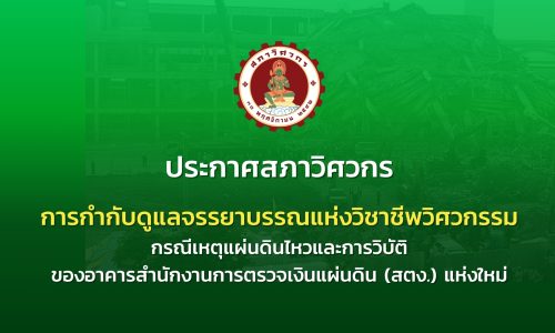 ประกาศสภาวิศวกร เรื่อง การกำกับดูแลจรรยาบรรณแห่งวิชาชีพวิศวกรรม กรณีเหตุแผ่นดินไหวและการวิบัติของอาคารสำนักงานการตรวจเงินแผ่นดิน (สตง.) แห่งใหม่ ตามที่ได้เกิดเหตุแผ่นดินไหวเมื่อวันที่ 28 มีนาคม พ.ศ. 2568 ซึ่งส่งผลกระทบรุนแรงในหลายพื้นที่ทั่วประเทศ รวมถึงอาคารสำนักงานการตรวจเงินแผ่นดิน (สตง.) แห่งใหม่ ซึ่งเป็นอาคารสูง 30 ชั้นที่อยู่ระหว่างการก่อสร้างและเกิดการวิบัติอย่างรุนแรง ส่งผลให้มีผู้เสียชีวิตและได้รับบาดเจ็บจำนวนมาก โดยสภาวิศวกรได้มีการแจ้งความคืบหน้าการดำเนินงานตามอำนาจหน้าที่ของสภาวิศวกรไปแล้วนั้น สภาวิศวกรขอเรียนว่า ตามมาตรา 51 และมาตรา 52 กำหนดให้เลขาธิการสภาวิศวกรจะต้องดำเนินการเสนอเรื่องกล่าวโทษต่อคณะกรรมการจรรยาบรรณโดยไม่ชักช้า เมื่อปรากฏข้อเท็จจริงจากสื่อสาธารณะว่ามีผู้ประกอบวิชาชีพวิศวกรรมควบคุมอาจเข้าข่ายประพฤติผิดจรรยาบรรณแห่งวิชาชีพวิศวกรรม เพื่อให้บุคคลดังกล่าวได้แสดงความบริสุทธิ์ผ่านกระบวนการพิสูจน์ทางด้านวิชาชีพที่โปร่งใสและเป็นธรรมจากผู้ทรงคุณวุฒิทางวิชาชีพ เมื่อคณะกรรมการจรรยาบรรณได้รับเรื่องกล่าวโทษแล้วอาจพิจารณาไม่รับเรื่องหรือส่งเรื่องต่อคณะอนุกรรมการกลั่นกรองทำหน้าที่ในการช่วยเหลือตรวจสอบข้อเท็จจริงและแสวงหาหลักฐานเพิ่มเติม ทั้งนี้ หากคณะอนุกรรมการกลั่นกรองเห็นว่า ข้อร้องเรียนไม่มีมูลก็จะไม่รับเรื่องไว้พิจารณาหรือหากเข้าข่ายการประพฤติผิดจรรยาบรรณแห่งวิชาชีพวิศวกรรม คณะกรรมการจรรยาบรรณจะแต่งตั้งคณะอนุกรรมการไต่สวนเพื่อไต่สวนในเชิงลึกต่อไป อนึ่ง การกล่าวโทษของสภาวิศวกรเป็นการดำเนินการตามพระราชบัญญัติวิศวกร พ.ศ. 2542 ในการกำกับดูแลด้านจรรยาบรรณแห่งวิชาชีพ เพื่อให้ความเป็นธรรมและเปิดโอกาสให้บุคคลดังกล่าว ได้แสดงความบริสุทธิ์ผ่านกระบวนการพิสูจน์ทางด้านวิชาชีพ และแม้จะมีการกล่าวโทษบุคคลใดแล้วก็ตามแต่บุคคลดังกล่าวก็ยังมีสิทธิที่จะได้รับการคุ้มครองตามกฎหมายและไม่ถือว่าเป็นผู้กระทำความผิดจรรยาบรรณวิชาชีพ จนกว่าจะมีคำตัดสินถึงที่สุด ประธานอนุกรรมการประชาสัมพันธ์22 พฤษภาคม 2568