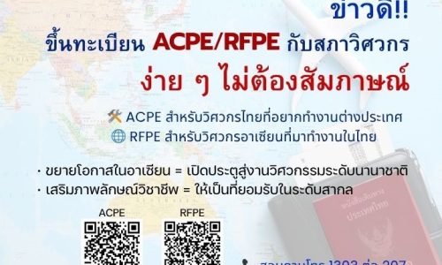 🎉🎉ข่าวดี สำหรับวิศวกรไทย! ขึ้นทะเบียน ACPE/RFPE กับสภาวิศวกร สะดวก รวดเร็ว ไม่ต้องสัมภาษณ์! ไม่ต้องรอ ไม่ต้องเตรียมตัวสัมภาษณ์อีกต่อไป ✨ASEAN Chartered Professional Engineer (ACPE)✨ สำหรับวิศวกรไทย (ระดับสามัญวิศวกร) ที่ต้องการไปทำงานต่างประเทศ ✨ Registered Foreign Professional Engineer (RFPE)✨ สำหรับวิศวกรอาเซียนที่ต้องการมาทำงานในประเทศไทย ✅ เหตุผลที่คุณไม่ควรพลาด: • ไม่มีสัมภาษณ์ = ประหยัดเวลา• ขยายโอกาสในอาเซียน = เปิดประตูสู่งานวิศวกรรมระดับนานาชาติ• เสริมภาพลักษณ์วิชาชีพ = มีสถานะวิศวกรวิชาชีพระดับภูมิภาค 💖สมัครเลยวันนี้💖 ACPE ➡️➡️➡️ คลิก RFPE ➡️➡️➡️ คลิก 📞สอบถามเพิ่มเติม 1303 ต่อ 207 (ฝ่ายต่างประเทศ)