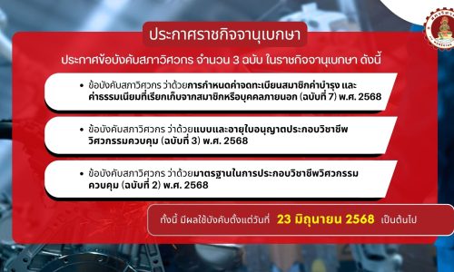 ประกาศข้อบังคับสภาวิศวกร จำนวน 3 ฉบับ ในราชกิจจานุเบกษา สำนักเลขาธิการคณะรัฐมนตรีได้ดำเนินการประกาศเรื่องข้อบังคับสภาวิศวกร จำนวน 3 เรื่อง ในราชกิจจานุเบกษา ฉบับประกาศและงานทั่วไป เล่ม 142 ตอนพิเศษ 227 ง วันที่ 23 มิถุนายน 2568 1️⃣ ข้อบังคับสภาวิศวกร ว่าด้วยการกำหนดค่าจดทะเบียนสมาชิกค่าบำรุง และค่าธรรมเนียมที่เรียกเก็บจากสมาชิกหรือบุคคลภายนอก (ฉบับที่ 7) พ.ศ. 2568 ✨✨✨มีสาระสำคัญ ✨✨✨ดังนี้ ✅ กำหนดอัตราค่าธรรมเนียมค่าคำขอเปลี่ยนแปลงข้อมูลใบอนุญาต ✅ กำหนดอัตราค่าธรรมเนียม 📌คลิกข้อบังคับสภาวิศวกร 2️⃣ ข้อบังคับสภาวิศวกร ว่าด้วยแบบและอายุใบอนุญาตประกอบวิชาชีพวิศวกรรมควบคุม (ฉบับที่ 3) พ.ศ. 2568 ✨✨✨มีสาระสำคัญ ✨✨✨ดังนี้ ✅ กรณีใบอนุญาตถูกทำลาย ชำรุด หรือสูญหาย ✅ กรณีประสงค์จะขอเปลี่ยนชื่อ ชื่อสกุล ภาพถ่าย เปลี่ยนหรือเพิ่มคำนำหน้าชื่อ หรือในลักษณะอื่นทำนองเดียวกัน 📌คลิกข้อบังคับสภาวิศวกร […]