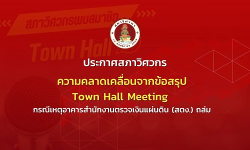 ประกาศสภาวิศวกร เรื่อง ความคลาดเคลื่อนจากข้อสรุป Town Hall Meeting กรณีเหตุอาคารสำนักงานตรวจเงินแผ่นดิน (สตง.) ถล่ม ตามที่สภาวิศวกรได้จัดกิจกรรม Town Hall Meeting เมื่อวันพุธที่ 2 กรกฎาคม 2568 เวลา 13.30 น. ณ ห้องวิศวภิวรรธน์ ชั้น 7 อาคารสภาวิศวกร เพื่อรายงานผลการดำเนินงานของสภาวิศวกร และเปิดเวทีรับฟังความคิดเห็นจากสมาชิก กรณีเหตุอาคารสำนักงานตรวจเงินแผ่นดิน (สตง.) ถล่ม นั้น เนื่องด้วยได้มีการเผยแพร่ข้อความที่คลาดเคลื่อนผ่านสื่อสังคมออนไลน์ว่า “…สรุปแล้วตึก สตง. น่าจะพังเพราะคอนกรีตผสมน้ำเยอะ…” เป็นการตีความที่คลาดเคลื่อนของผู้รับฟังผู้หนึ่ง ซึ่งมิใช่ความเห็นหรือแถลงการณ์ของสภาวิศวกรแต่อย่างใด ทั้งนี้ กิจกรรม Town Hall Meeting ดังกล่าวมีสมาชิกเข้าร่วมเป็นจำนวนมาก และได้แสดงความคิดเห็นรวมถึงข้อเสนอแนะอันเป็นประโยชน์กับสภาวิศวกร อย่างไรก็ตามสภาวิศวกรได้เน้นย้ำว่าสาเหตุที่แท้จริงยังต้องรอรายงานฉบับสมบูรณ์จากคณะกรรมการสอบสวนข้อเท็จจริงซึ่งแต่งตั้งโดยรัฐมนตรีว่าการกระทรวงมหาดไทยเสียก่อน จึงประกาศมาเพื่อทราบโดยทั่วกัน 3 กรกฎาคม 2568สภาวิศวกร