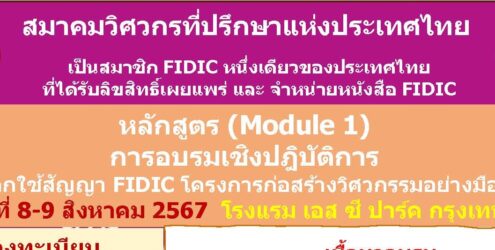 สมาคมวิศวกรที่ปรึกษาแห่งประเทศไทยขอเชิญเข้าร่วมอบรมเชิงปฏิบัติการ หลักสูตร (Module 1) “การเลือกใช้สัญญา FIDIC โครงการก่อสร้างวิศวกรรมอย่างมืออาชีพ” ในวันที่ 8-9 สิงหาคม 2567 โรงแรมเอส ซี ปาร์ค กรุงเทพฯ คลิกลงทะเบียน *พิเศษ สำหรับผู้อบรมหลักสูตรนี้ จะได้รับหนังสือสัญญา FIDIC ฉบับแปลเป็นภาษาไทย (แบบมีลิขสิทธิ์) มีจำนวนจำกัด*