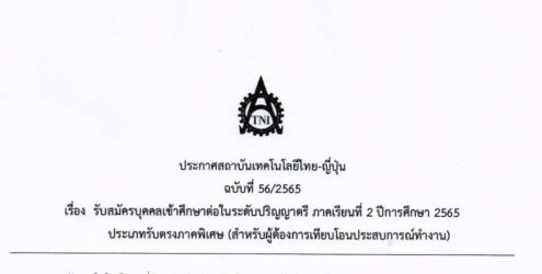 25 Aug 2022สถาบันเทคโนโลยีไทย-ญี่ปุ่น เปิดรับสมัครบุคคลเข้าศึกษาต่อในระดับปริญญาตรี ภาคเรียนที่ 2 ปีการศึกษา 2565 ประเภทรับตรงภาคพิเศษ